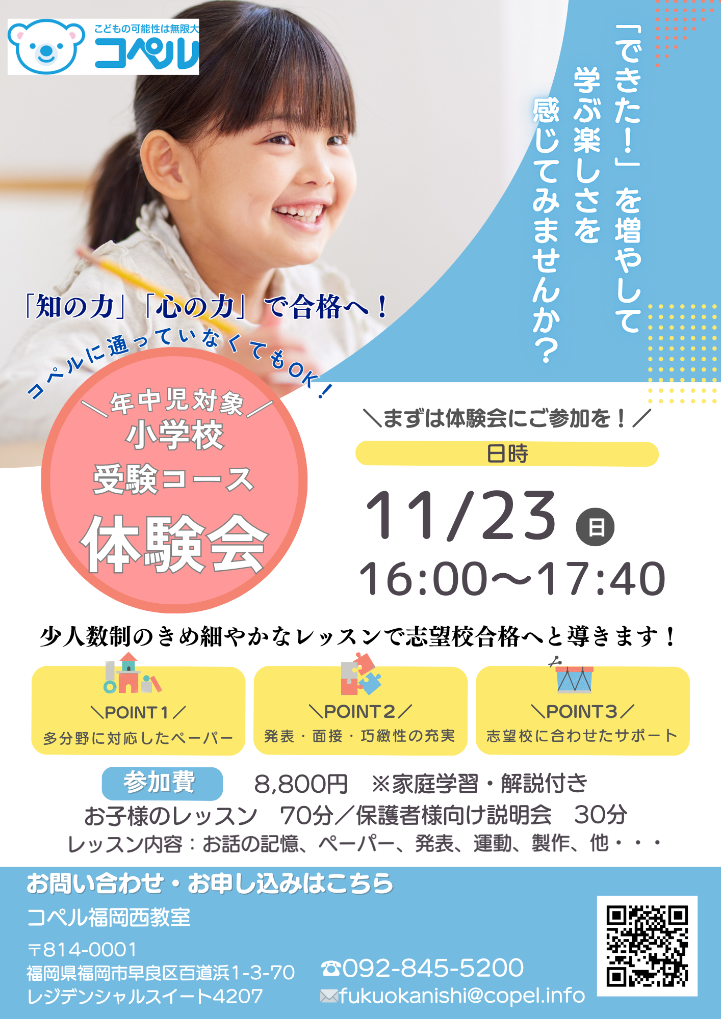 福岡西教室│年中児対象 小学校受験コースの体験会のご案内
