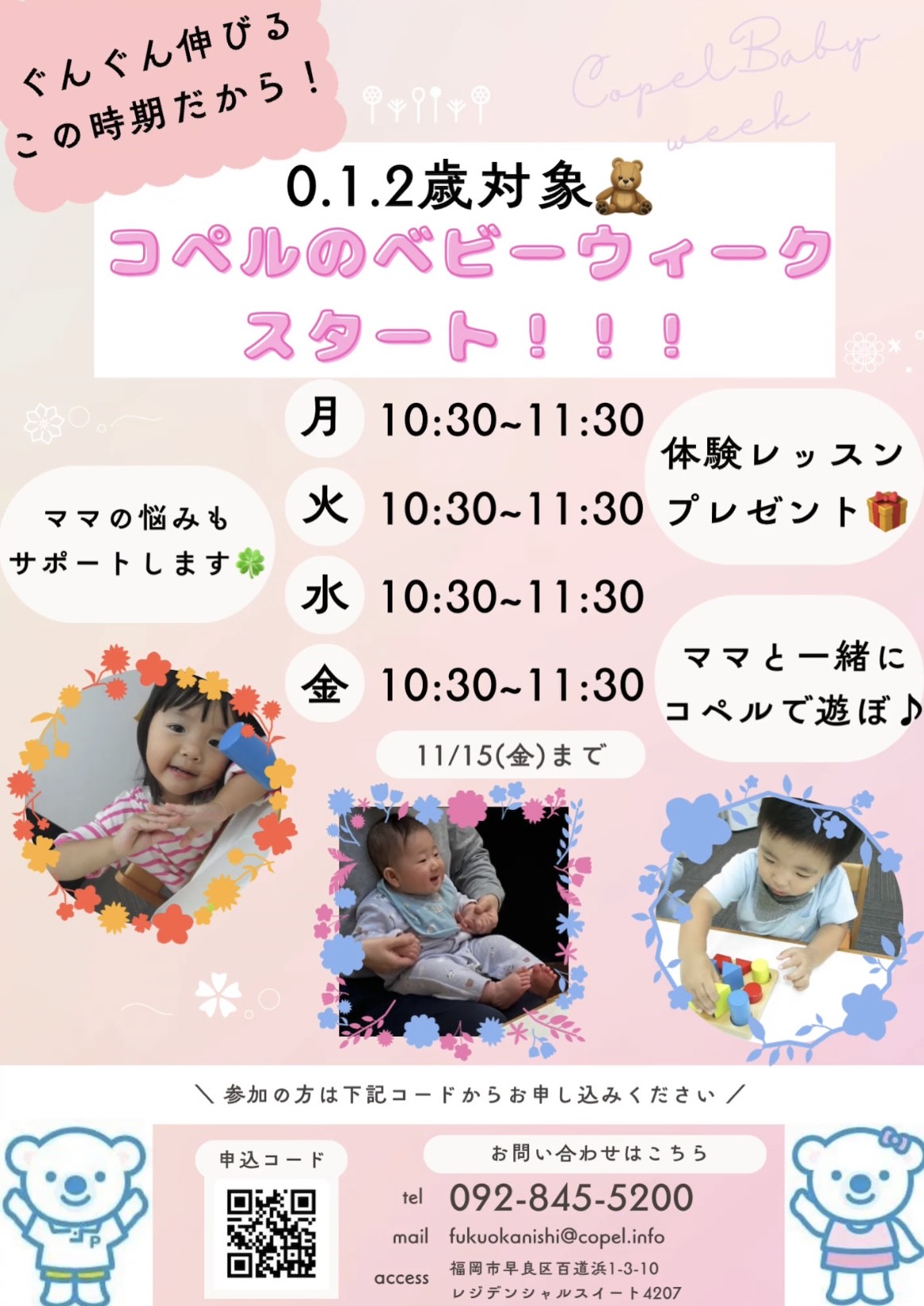 イベント 2024年11月15日 福岡西教室│[0-2歳対象]ベビーウィーク コペル福岡西教室では、0歳・1歳・2歳の学年のお子様と保護者様向けに「ベビーウィーク」をスタートいたしました! 11月15日(金)までの教室限定イベントです🎵 お母さんと一緒に、コペルで思いっきりあそびましょう✨ お申し込みは教室へのお電話か、QRコードからお願いいたします。 福岡西教室 092-845-5200 この記事をシェアする