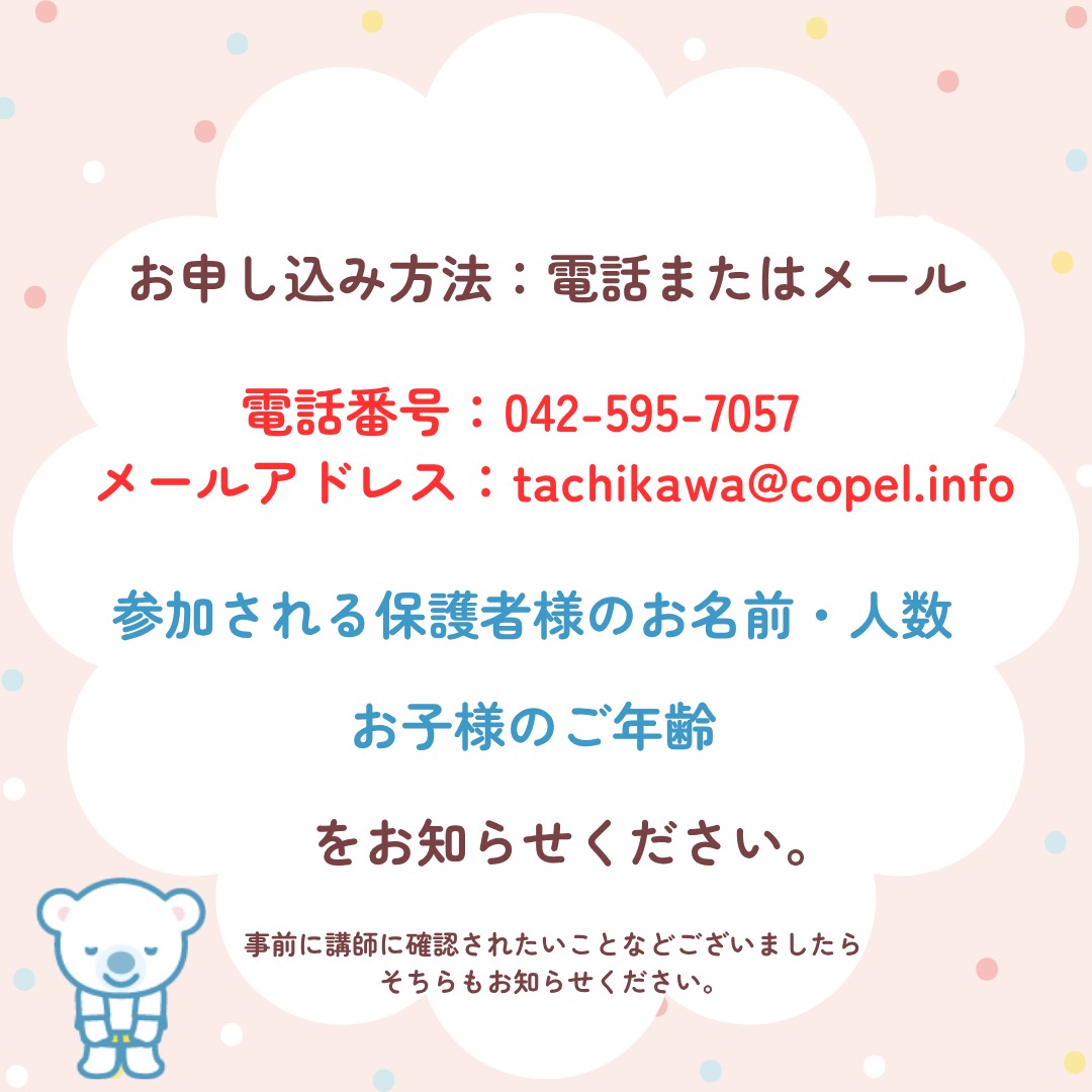 お申し込みは、お電話(042-595-7057)またはメール(tachikawa@copel.info)にてお願いいたします。