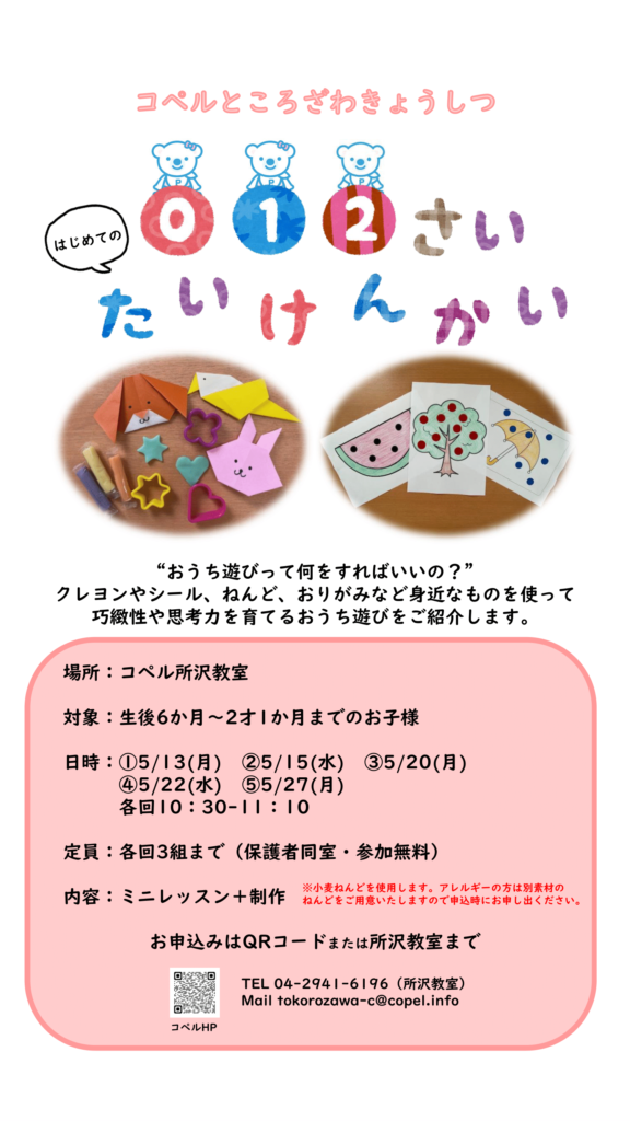 イベント 2024年05月01日 所沢教室│無料【0・1・2さい たいけんかい】 5月に0・1・2才さん対象の体験会を行います! 月齢が低いほど家では取り組みにくい、折り紙・ねんど・クレヨン・シールをつかって“はじめての作品”をつくります。 おうち遊びのヒント、知育の導入方法もご紹介しますので是非遊びにいらしてください😊 ※小麦ねんどを使用予定ですので、アレルギーのあるお子様は必ずお申し出ください。 コペル所沢教室(定休日:木・金) TEL 04-2941-6196 Mail tokorozawa-c@copel.info この記事をシェアする