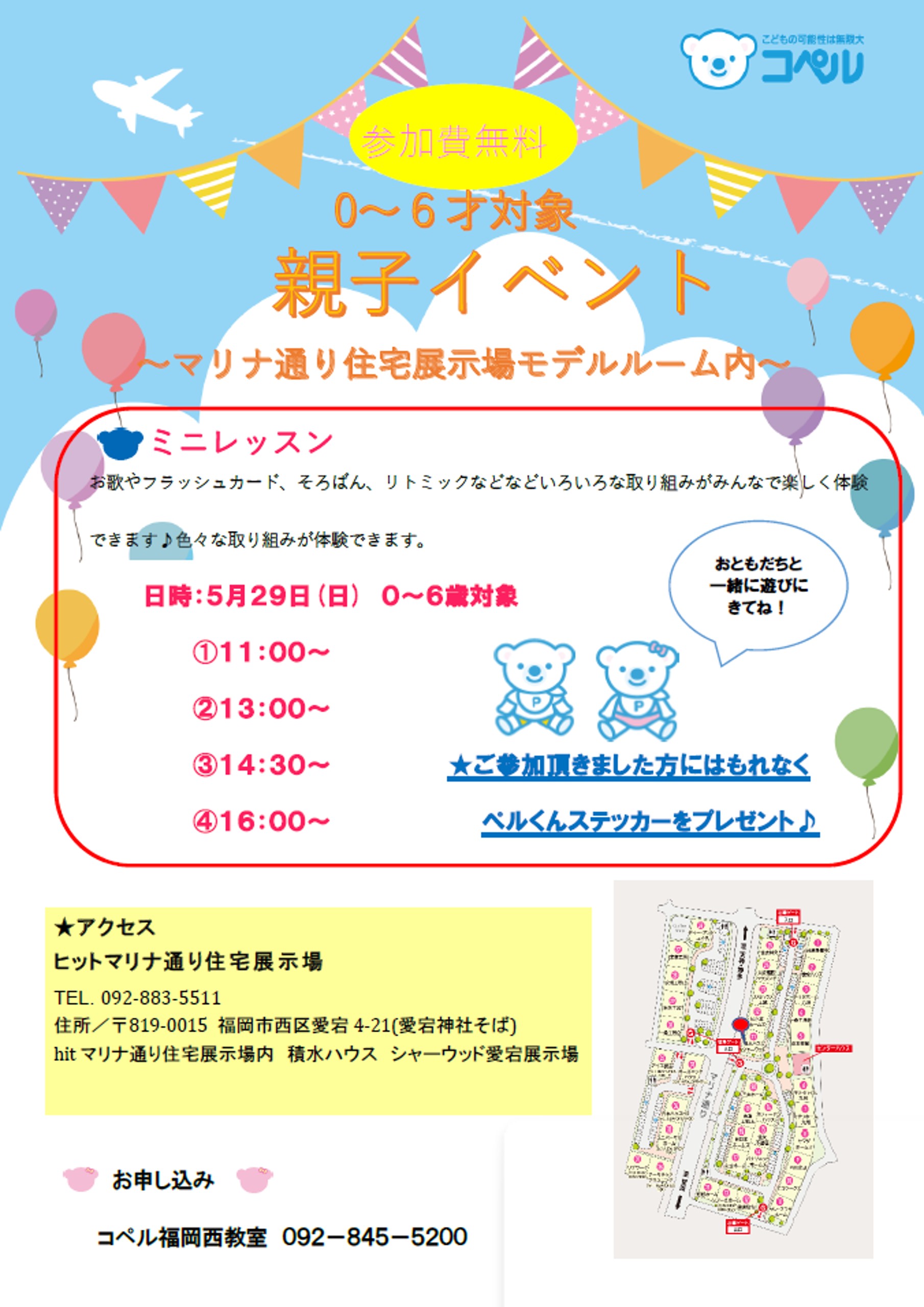 5月29日(日)にマリナ通り住宅展示場内にて0~6歳向け親子イベントを行います!