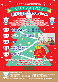 12/24(日) 東京都文京区の幼児教室コペル 江戸川橋教室 にて、「クリスマスイベント★親子で作ろうスノードーム」を開催いたします。