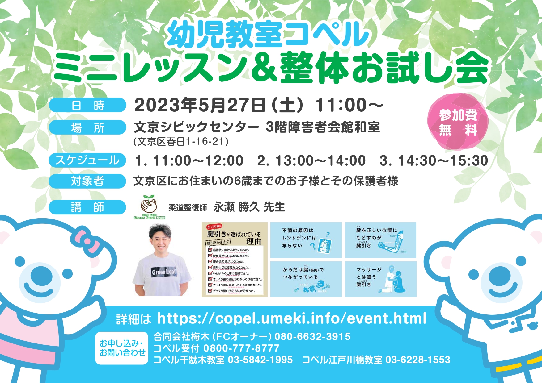 当日は柔道整復師の永瀬勝久先生による、お子様の身体に合わせた整体を体験いただけます。