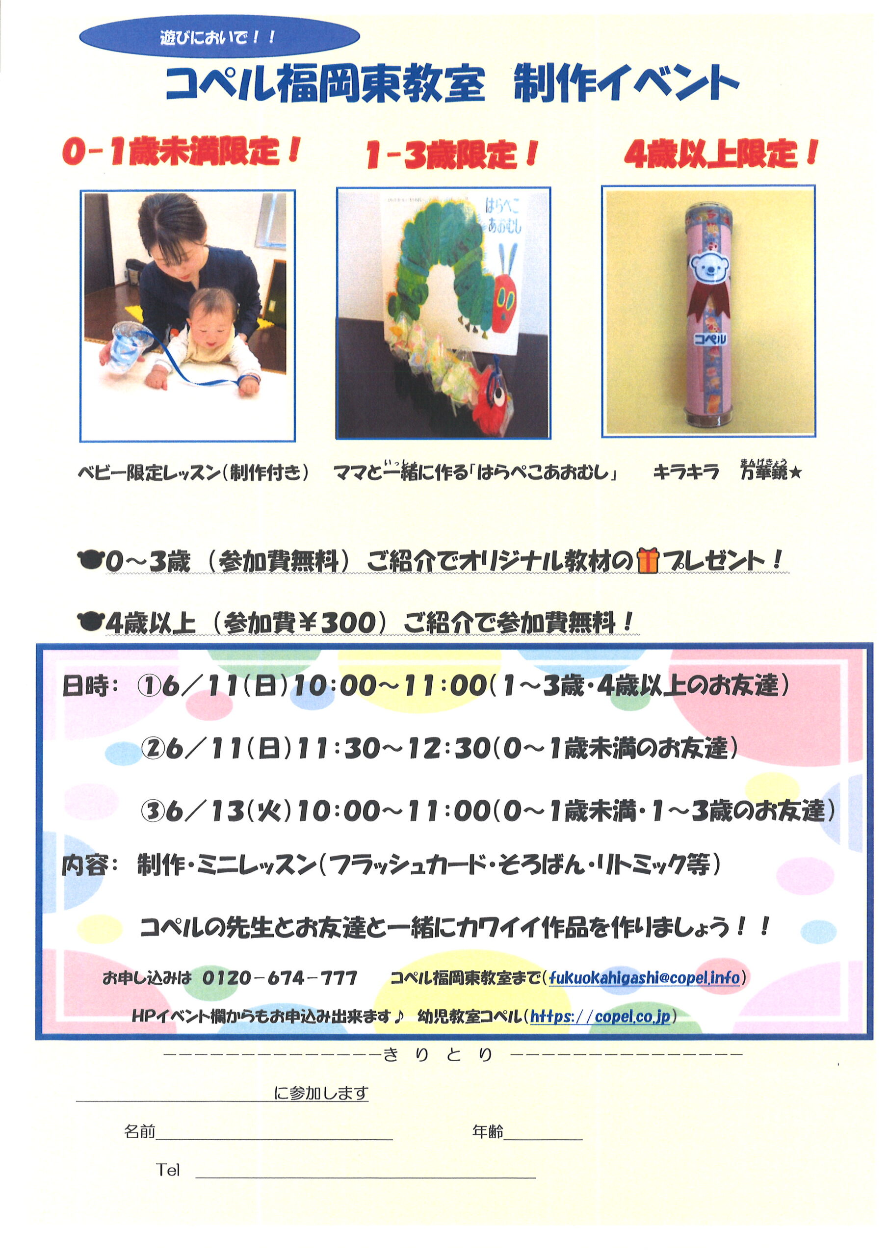 イベント 2023年05月16日 福岡東教室|2日間制作イベント開催! コペル福岡東教室にて6/11(日)13(火)制作イベントを開催します! 内容は0~1歳未満のお友達、1~3歳のお友達、4歳以上のお友達と それぞれ年齢に合わせた制作とミニレッスンのプレゼント!! コペルに通っていないお友達も参加できます♪ 興味のある方、是非この機会に遊びに来てみませんか?! お問い合わせはこちらまで👇 コペル福岡東教室 📞0120-674-777 この記事をシェアする