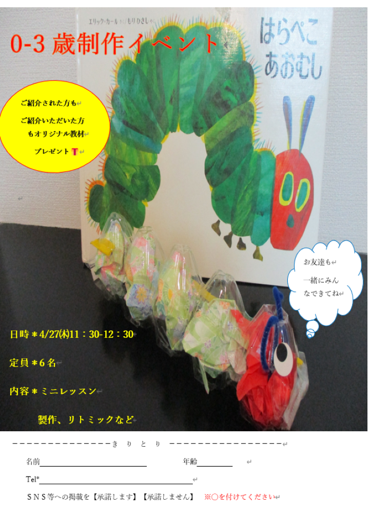 楽しいレッスンとたくさんのお歌、みんなおなじみの『はらぺこあおむし』の絵本とオリジナルのあおむしくんを作りに来ませんか?