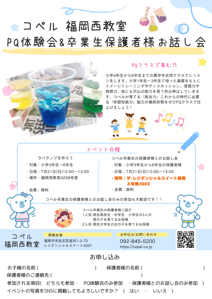 イベント 2024年06月20日 福岡西教室│PQ体験会&卒業生保護者様お話し会 昨年も大変ご好評いただいたイベントが帰ってきました。 小4~小6合同クラスのPQ体験会を実施します。 7月21日(日)12:00~13:00です。 卒業生のお母様お二人をお招きしてのお話し会も同時開催いたします。 コペルの卒業生からは『コペルを卒業してからコペルの効果を実感しました』というお声を今までに沢山いただいております。 保護者様とのお話し会のみの参加も大歓迎です。ぜひお越しください! お申し込み/お問い合わせ: ☎092‐845‐5200 またはホームページから 開催:福岡西教室 この記事をシェアする