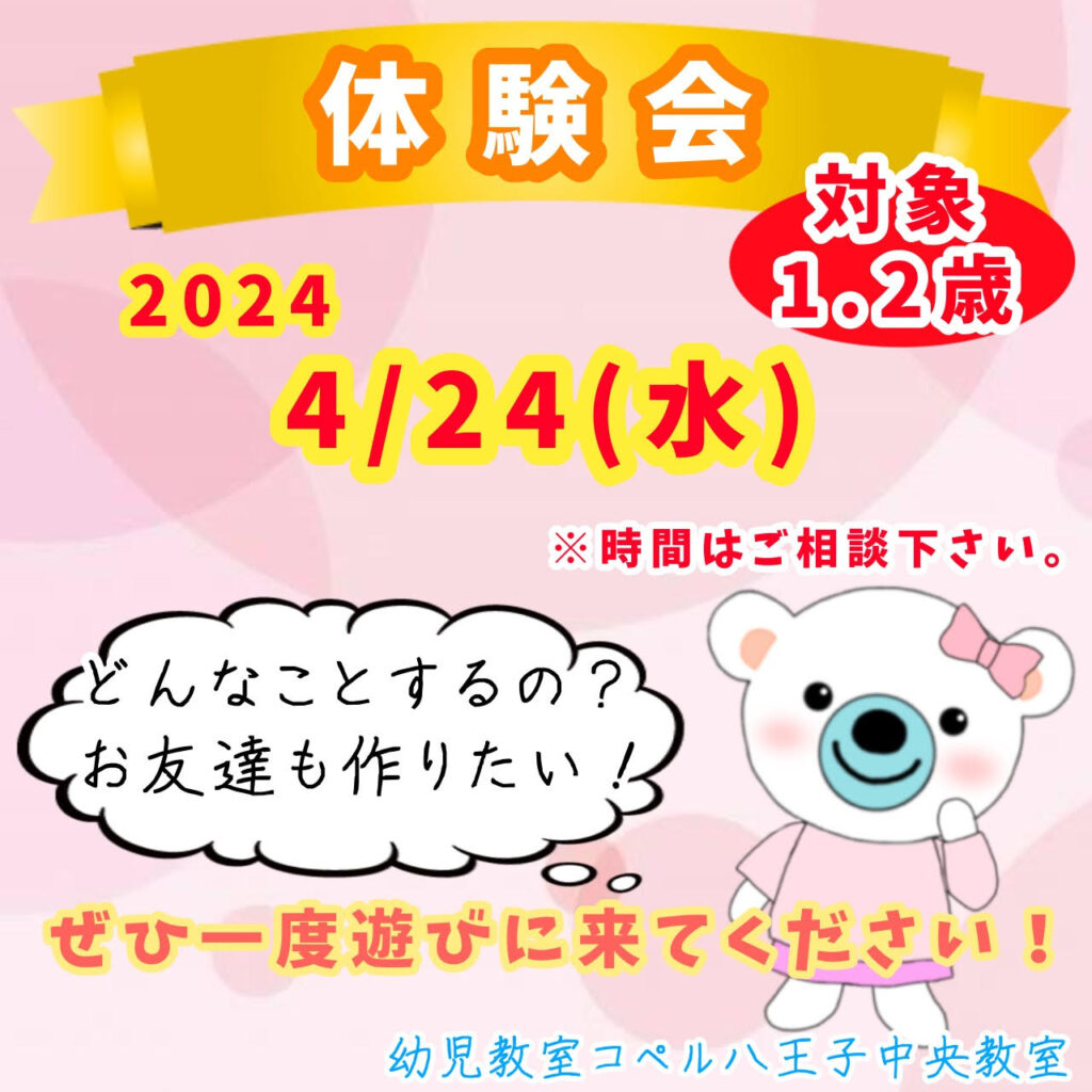 イベント 2024年04月09日 八王子中央教室│無料体験会 【無料体験会】実施いたします♪ 幼児教室コペル八王子中央教室にて 4/24(水)に無料体験会を行います!どんなレッスン?お友達も作れるかな? という方にぜひ楽しんでもらえるようなレッスンをお届けします♪ 更に4・4月中は先着10名様、体験者対象に教材プレゼントキャンペーンも行います☆彡 体験にいらして、入室して下さった方へ「ひらがな・カタカナ表」をプレゼントしておりますので ぜひ一度遊びにいらして下さい♪ 講師 貫井 廣澤 この記事をシェアする