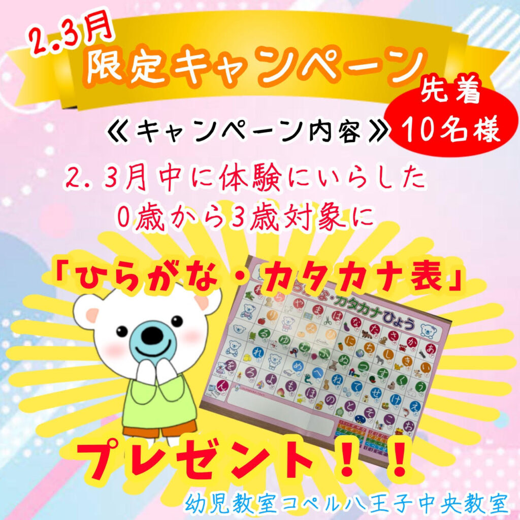更に2・3月中は先着10名様、0歳から3歳対象に教材プレゼントキャンペーンも行っております。