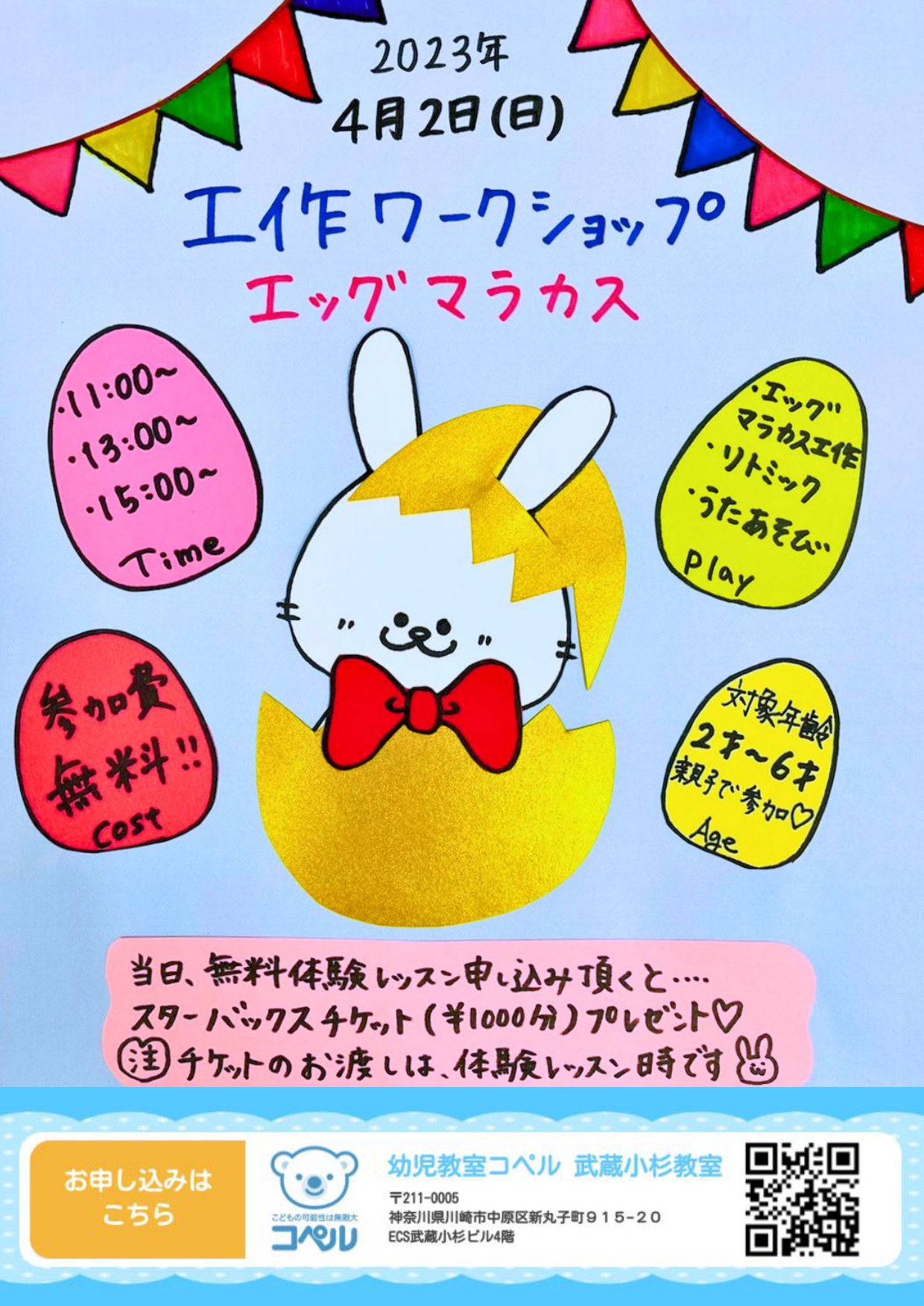 イベント 2023年03月28日 武蔵小杉教室|工作ワークショップ開催のお知らせ♪ 【応募締め切り】 2023年3月31日 【定員】 6組 【開催場所】 コペル武蔵小杉教室 【対象年齢】 2歳~6歳 新規の方 【応募方法】 QRコード予約ページから応募 【参加費】 無料 この記事をシェアする