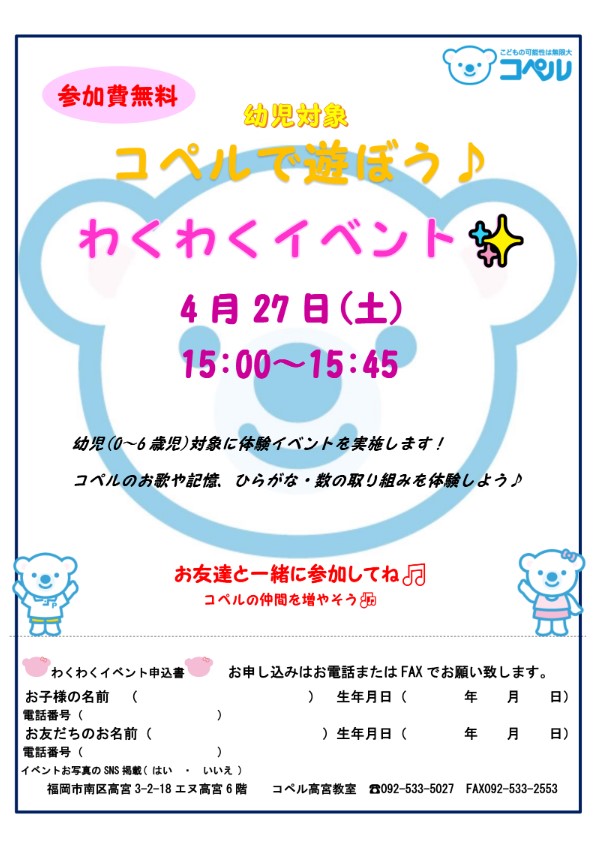 イベント 2024年04月09日 高宮教室│わくわくイベント 高宮教室では幼児対象に コペルで遊ぼう♪わくわくイベント✨ を開催します! 4月27日(土) 15:00~15:45 コペルのお歌や記憶、ひらがな・数の取り組みを体験してください! 沢山の方のご参加お待ちしております🎶 コペル高宮教室☎092-533-5027 この記事をシェアする