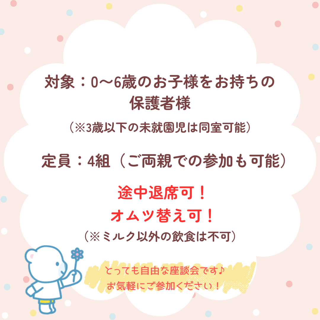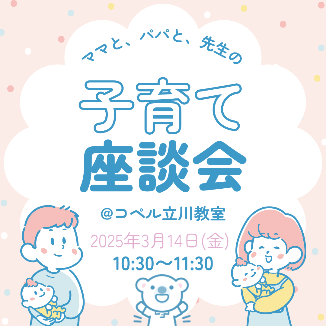 イベント 2025年03月14日 立川教室│「ママと、パパと、先生の子育て座談会」 「ママと、パパと、先生の子育て座談会」を開催いたします♪ 日時:2025年3月14日(金)10:30〜11:30 場所:コペル立川教室 定員:4名(3歳以下の未就園児は同室可能) お電話(042-595-7057)またはメール(tachikawa@copel.info)にてお申し込みください。 この記事をシェアする