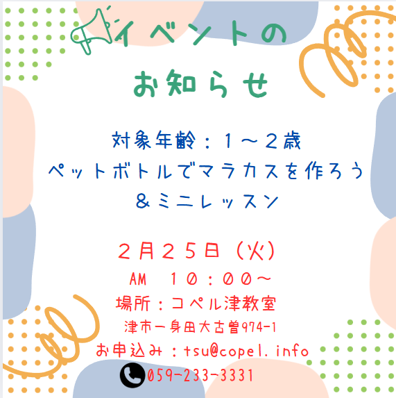 津教室│1~2歳 ペットボトルでマラカスを作ろう&ミニレッスン