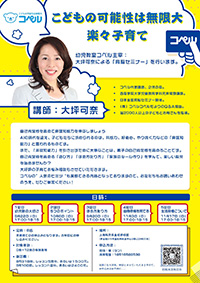 お知らせ 2019年08月29日 09/22(日)から上海にて講演いたします。 09/22(日)から上海にて、5回にわたり、コペル主宰:大坪可奈による「子育てセミナー」がおこなわれます。 もし、上海に、子育て中のお知り合いがいらっしゃいましたら、お伝えいただけますと幸いです。 ※画像をクリックすると拡大します この記事をシェアする